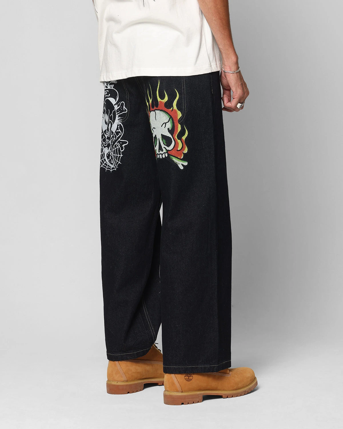 Step up your style game with the Ed Hardy Wide Leg Skull Jeans—where classic craftsmanship meets bold artistic expression. Designed to celebrate individuality, these jeans feature unique embroidered and printed graphics that celebrate the artistic tattoo designs of Ed Hardy and details that make a statement with every wear and the baggy wide-leg fit that blends the effortless streetwear style. Finished with premium denim construction and contrast stitching ensures you stand out from the rest. This is a must-have in any wardrobe.