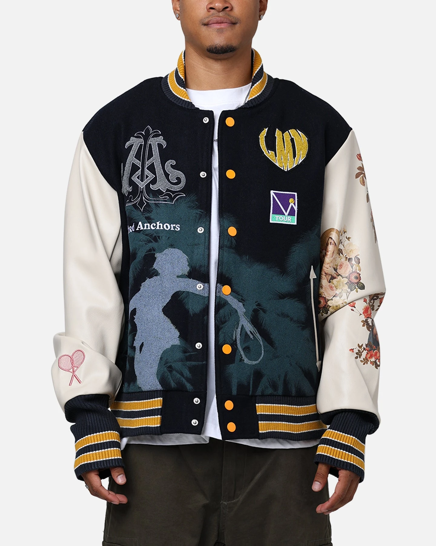 Make a statement with the “Kournikova” Varsity Tennis Jacket by Lifted Anchors. The best way to finish your fit is by capping it with this jacket and its bold design to help you make a statement. Decked out with contrast sleeves, embroidered graphics, a chenille logo patch, contrast ribbed cuffs and hem, and a full summary snap close this jacket has it all. Cop yours today!