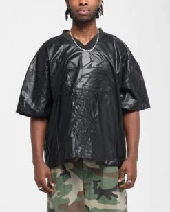 Cop the Vegan Leather Football Top by Loiter for the perfect blend of street and sportswear. This top features embroidered graphics on vegan leather for a multidimensional style that is finished with dropped shoulders for a laid back feel. You don’t wanna be sleeping on this one. Cop yours today at Culture Kings.