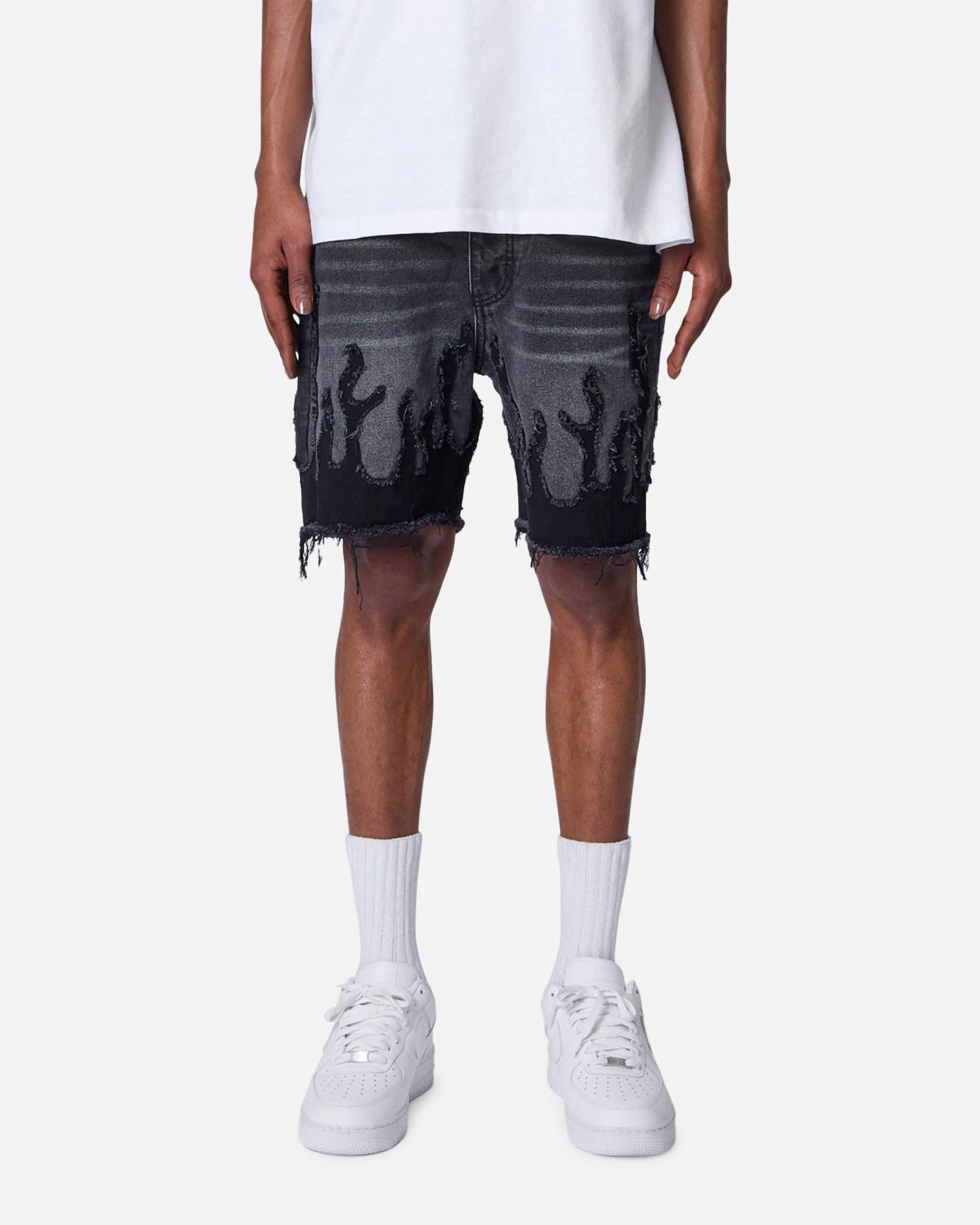 Introducing the Flame Denim Shorts by MNML. These shorts are crafted from premium cotton denim for ultimate comfort. These shorts feature a standard fit, ensuring a timeless silhouette. With intricate flame and dual-tone detailing, along with a distressed finish, they exude a bold and edgy style. Cop yours today at Culture Kings.