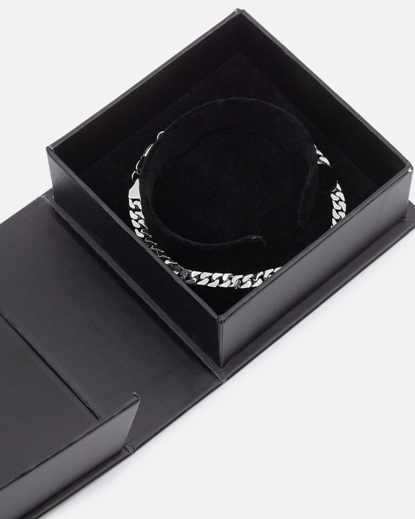 The Flat Faced Curb chain is a flat link chain, featuring snug, square links that lay perfectly flat under or over tees for a seamless look. Its tight link design offers less movement compared to the classic Cuban chain, but its extreme polish finish reflects more light, creating a radiant sheen. While there may be better chains suited to pendants, if you are opting to add a pendant to this one we recommend going for a bulkier pendant to complement the chain and give you a flawless finishing touch to your look.