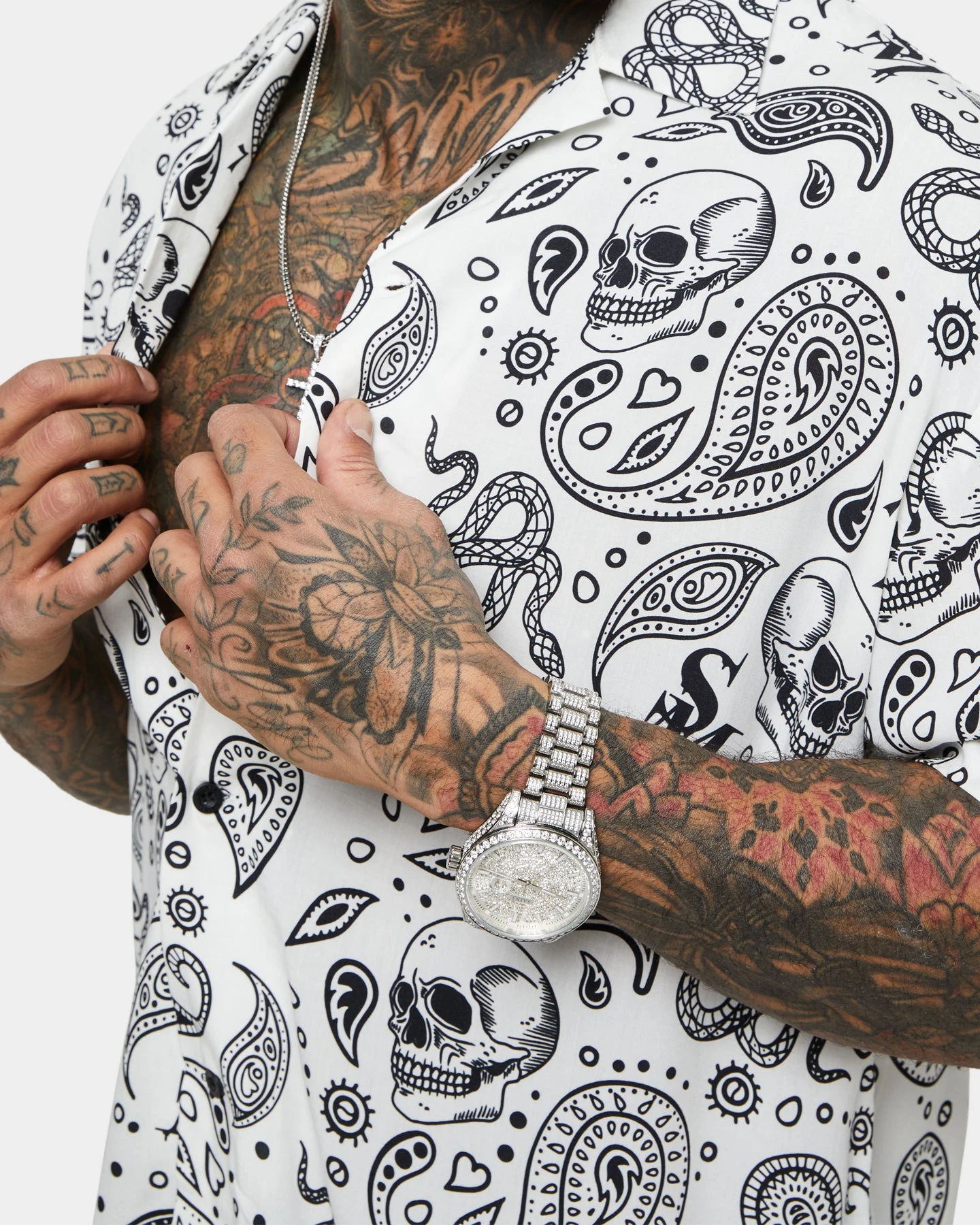 The Paisley Skulls Short Sleeve Button Up Shirt seamlessly blends a sick paisley print, fold-over collar, and short-sleeved to create the ultimate shirt. This summary-up shirt is the perfect piece for a day or night event, cop yours today!
