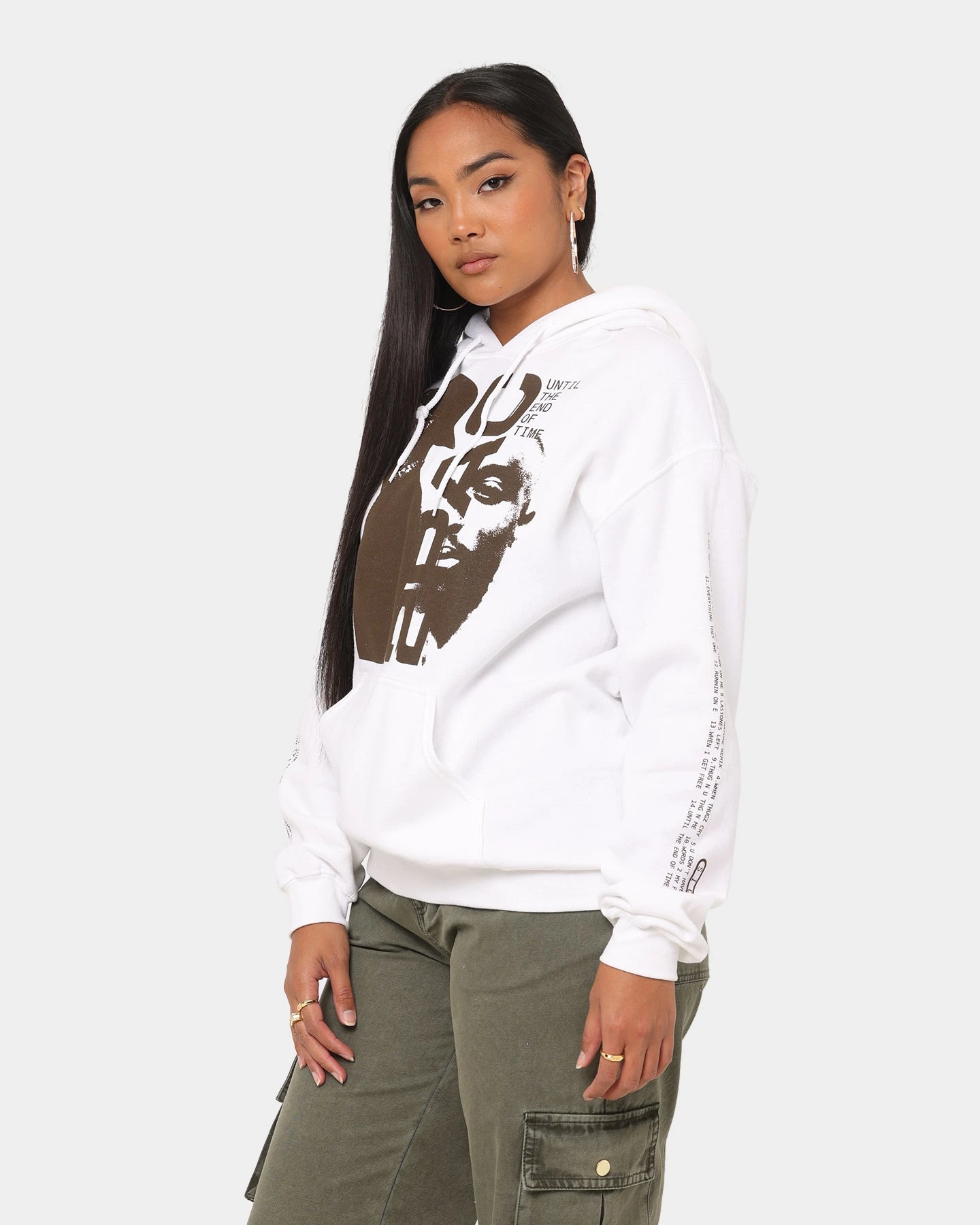 Any Tupac fans will recognise the Until The End Of Time album artwork showcased on this hoodie. The album tracklist has also been added to the sleeves to give this hoodie concert merch vibes. Make sure to grab this item to show your love of this American rapper.