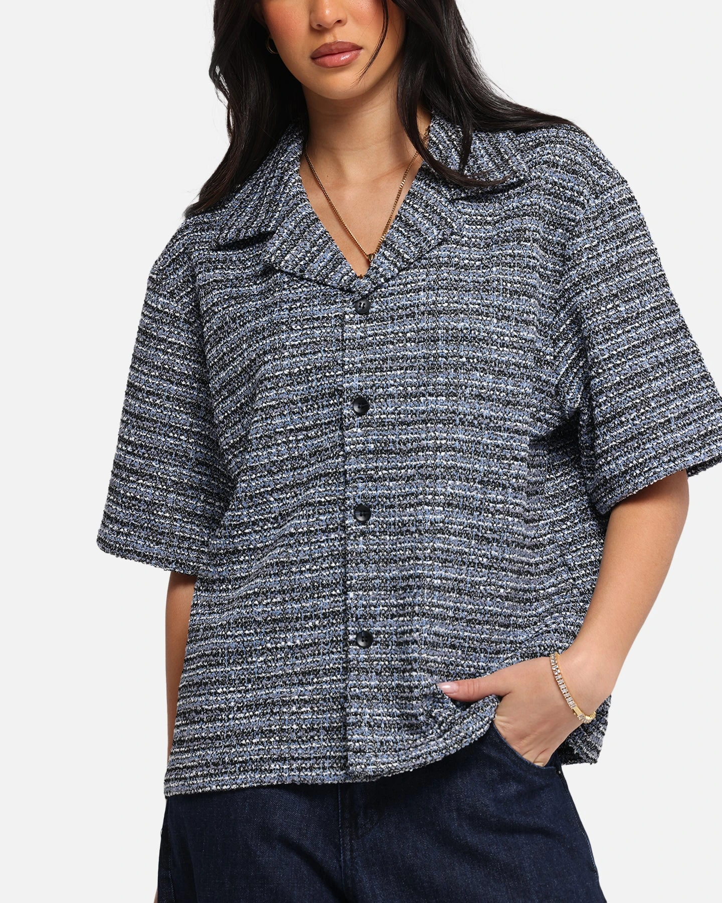 Step into the spotlight and level up your look with the XXIII Boucle Tweed Crop Button Up. Crafted from luxe boucle tweed adds some texture with a cropped silhouette and summary- up close for a versatile look. Finished with an all-over print to make you stand out from the rest. Cop yours today at Culture Kings.